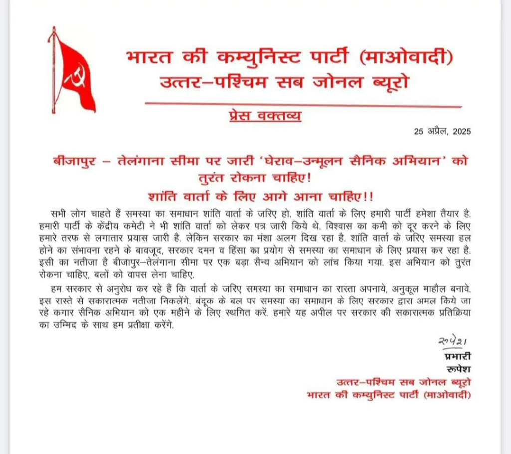भारत की कम्युनिस्ट पार्टी (माओवादी) के उत्तर-पश्चिम सब जोनल ब्यूरो के प्रभारी रूपेश द्वारा जारी किए गए पत्र में सबसे पहले बीजापुर-तेलंगाना सीमा पर तेलंगाना, आंध्र प्रदेश और छत्तीसगढ़ में तैनात सुरक्षा बलों की संयुक्त कार्रवाई को तत्काल रोकने की मांग की गई है। इसके साथ ही, सरकार से शांति वार्ता के लिए आगे आने का आह्वान किया गया है।