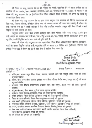 Chhattisgarh : खैरागढ़ जिले में शिक्षा विभाग से जुड़ा एक गंभीर फर्जीवाड़ा सामने आया है। राज्य शिक्षा आयोग और शिक्षा विभाग के सचिव डॉ. ओ.पी. मिश्रा के नाम से जारी किए गए नकली नियुक्ति पत्रों की मदद से वर्ष 2021 से आठ लोग अलग-अलग सरकारी कार्यालयों और स्कूलों में नौकरी कर रहे थे। मामले का खुलासा होने के बाद जिला शिक्षा अधिकारी लाल जी द्विवेदी ने तत्काल कार्रवाई करते हुए चार कर्मचारियों को बर्खास्त कर दिया।