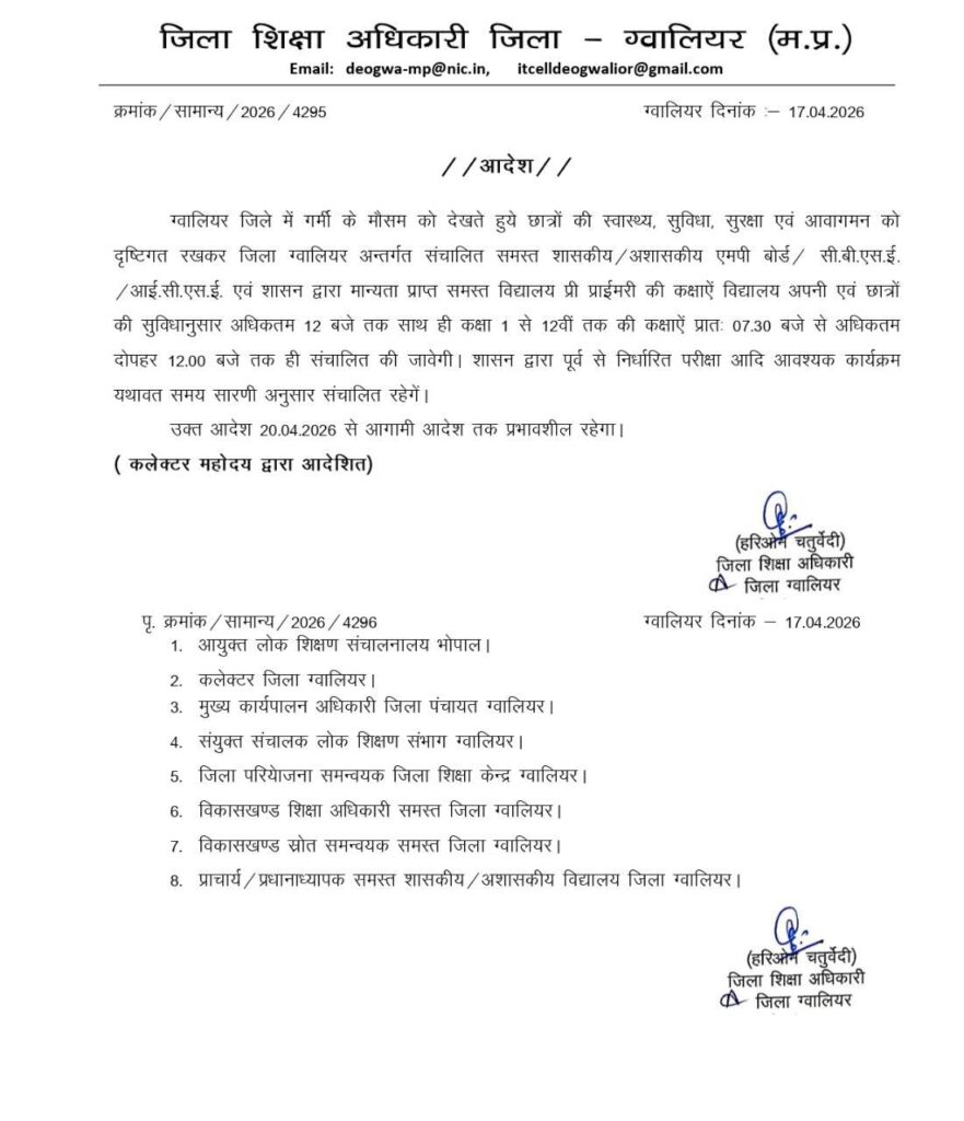 Gwalior School Update दोपहर 12:00 बजे तक ही लगेंगी कक्षाएं