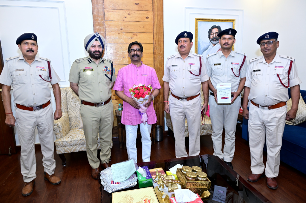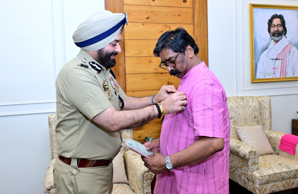 Ranchi : झारखंड के मुख्यमंत्री श्री हेमन्त सोरेन से आज रांची स्थित उनके आवासीय कार्यालय में होमगार्ड और अग्निशमन सेवा के पुलिस महानिदेशक श्री एम. एस. भाटिया ने शिष्टाचार भेंट की। इस विशेष मुलाकात का मुख्य उद्देश्य ‘अग्निशमन सेवा सप्ताह’ के उपलक्ष्य में मुख्यमंत्री को प्रतीक स्वरूप बैज लगाना था। मुख्यमंत्री ने इस अवसर पर पूरे विभाग को अपनी शुभकामनाएं प्रेषित कीं।