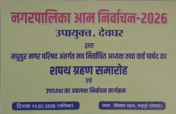 Madhupur Municipal Council समारोह में मधुपुर एसडीओ (SDO) राजीव कुमार सहित जिले के कई वरीय अधिकारी और गणमान्य नागरिक उपस्थित थे। शपथ ग्रहण के बाद नवनिर्वाचित प्रतिनिधियों का उनके समर्थकों ने फूल-मालाओं के साथ भव्य स्वागत किया। स्थानीय प्रशासन ने उम्मीद जताई है कि नया बोर्ड जनभावनाओं के अनुरूप शहर के विकास को गति प्रदान करेगा।