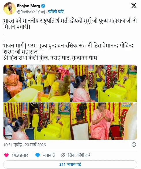 - श्रद्धा भाव: राष्ट्रपति ने महाराज जी के सरल जीवन, उनकी अडिग कृष्ण भक्ति और उनके द्वारा समाज को दिए जाने वाले सादगीपूर्ण उपदेशों के प्रति अपना सम्मान व्यक्त किया। उन्होंने महाराज जी के स्वास्थ्य और उनके सेवा कार्यों की भी सराहना की।
