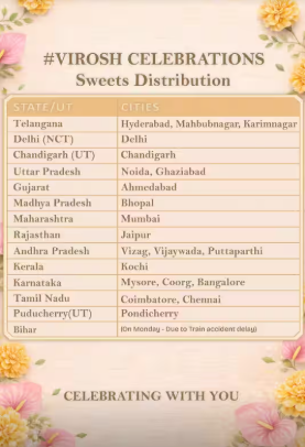 इसके अलावा तेलंगाना और आंध्र प्रदेश के कुछ शहरों के साथ बिहार में भी मिठाई बांटने की योजना है।