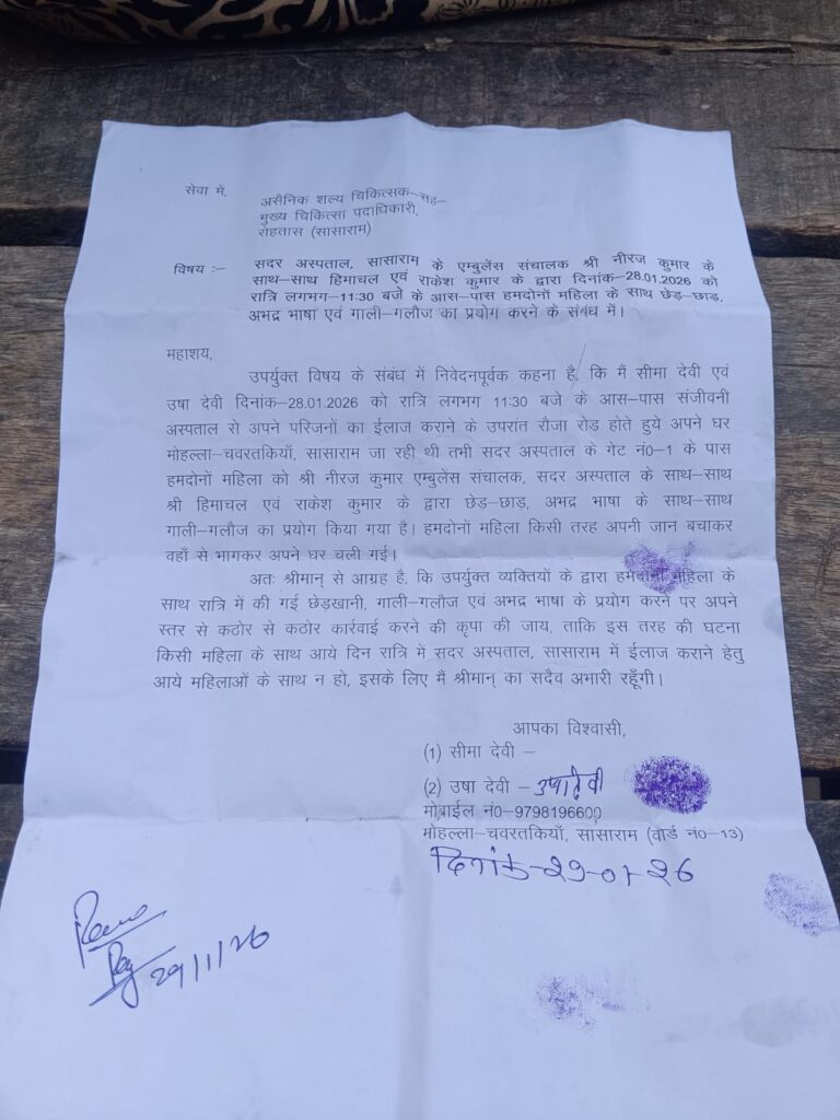 सासाराम स्थित सदर अस्पताल में तैनात सरकारी एंबुलेंस चालकों पर दो महिलाओं ने छेड़छाड़ और अभद्र व्यवहार जैसे गंभीर आरोप लगाए हैं। इस घटना को लेकर अस्पताल परिसर की सुरक्षा व्यवस्था पर भी सवाल खड़े हो गए हैं। पीड़ित महिलाओं ने पूरे मामले की लिखित शिकायत सिविल सर्जन को सौंपते हुए दोषियों के खिलाफ कड़ी कार्रवाई की मांग की है।