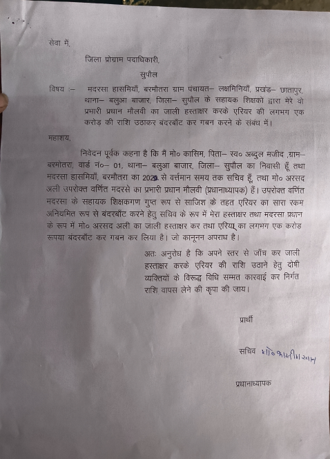 Supaul : बिहार के सुपौल जिले से भ्रष्टाचार का एक ऐसा मामला सामने आया है जिसने शिक्षा और प्रशासनिक व्यवस्था की नींद उड़ा दी है। छातापुर प्रखंड के ग्राम पंचायत लक्ष्मीनियां स्थित मदरसा हासिमिया (बरमोतरा) में मृत शिक्षकों और सेवा निवृत कर्मचारियों के नाम पर फर्जी तरीके से लगभग 1 करोड़ रुपये की निकासी का गंभीर आरोप लगा है। इस घोटाले की गूँज प्रमंडलीय आयुक्त की जनसुनवाई तक पहुँचने के बाद अब जिलाधिकारी (DM) सावन कुमार ने दोषियों के खिलाफ सख्त कार्रवाई के निर्देश दिए हैं।